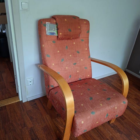 Keinuva nojatuoli, jossa vaalea kangasverhoilu ja puinen runko sekä käsinojat. Tuolissa on korkea selkänoja ja erillinen niskatyyny. Sopii olohuoneeseen tai lukutuoliksi rentoon istumiseen.kangas pesua vailla mutta ehjä ja siisti