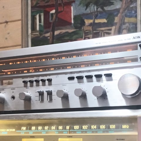 Hienokuntoinen ja huollettu perspekta stereovastaanotin kaiuttimineen.