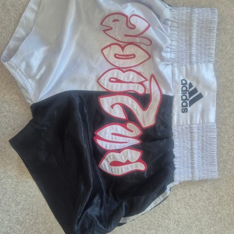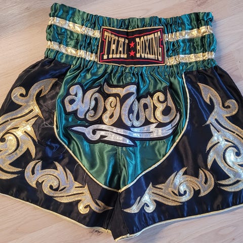 Twins thainyrkkeilyshortsit unisex-käyttöön. Koko XL. Väri pääosin musta, koristeina kultaisia ja monivärisiä painatuksia. Sopivat kamppailulajeihin, kuten nyrkkeilyyn tai potkunyrkkeilyyn, tarjoten liikkumavaraa ja lyhyen lahkeen treeneihin ja otteluihin. Käyttämättömät, ostettu 2018.
