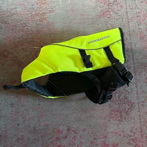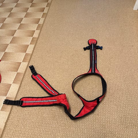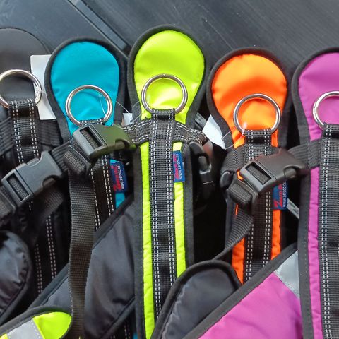 Hau-Hau Outdoor koiranvaljaat, pituus noin 90 cm. Väri pinkki, jossa heijastavat 3M Scotchlite -materiaalista valmistetut raidat parantamassa näkyvyyttä hämärässä. Valjaissa on muovinen pikalukko, säätömahdollisuus sekä useita metallisia kiinnitysrenkaita talutushihnaa varten. Soveltuu koiralle, jonka rinnanympärys on noin 80- 90 cm.