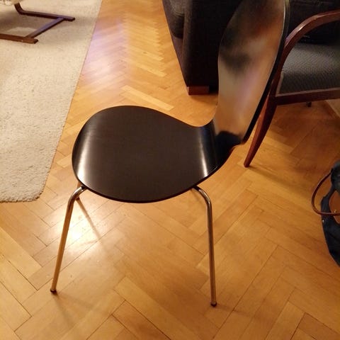 Mustat tuolit. Toisessa tuolissa maali kulunut näkyy kuvassa. Käytön jälkiä, mutta oikein toimivat tuolit.