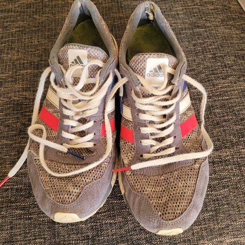 Adidas juoksukengät, koko 41 ja puol. Väritys harmaa valkoisilla raidoilla ja vihreillä yksityiskohdilla. Nauhakiinnitys ja kumipohja, jossa kuviointi pidon parantamiseksi. Soveltuvat juoksuun ja muuhun kevyeen liikuntaan.