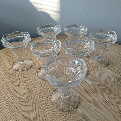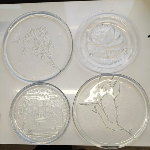 Lasiastiasarja, jossa on 9 lasilautasta. Lautasten pinnassa on kukkakuvio ja reunoilla koristeellinen kuviointi ja kullanvärinen reunus. Lautaset ovat noin 1950- tai 60-luvulta. Osassa lautasia etenkin kultarenuksessa pieniä kulumia.