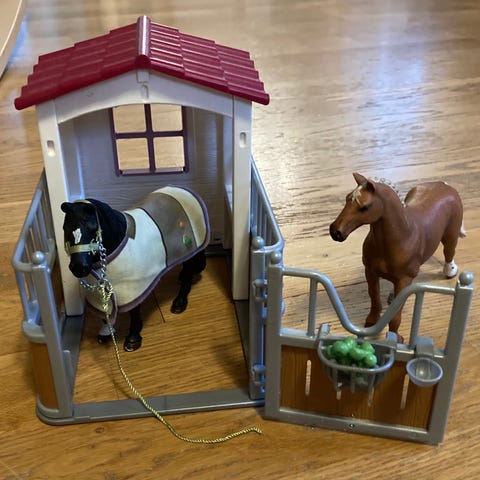Hieno heppa talli seuraavalle leikkijälle.Parista ovesta saranat hieman rikki ja yksi tanko puuttuu mutta muuten siisti ja muuten ehjä.