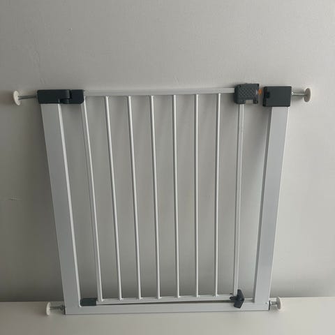 BabyDan turvaportti, valkoinen metallinen malli. Soveltuu käytettäväksi esimerkiksi portaiden ylä- tai alapäähän tai oviaukkoon lapsen tai lemmikin kulun rajoittamiseen. Mukana asennusohje ja kiinnitystarvikkeita kuvan mukaisesti.