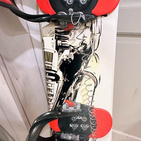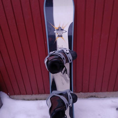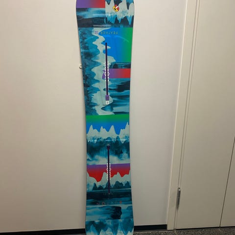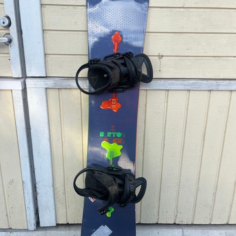 Burton Custom 44 lumilauta siteillä. Laudassa on musta pohjaväri ja graafisia yksityiskohtia oransseilla ja vaaleanpunaisilla tehosteilla. Pituusmerkintä 44 (mallimerkintä B1306). Sopii lasketteluun rinteissä ja yleiseen all mountain -käyttöön. Siteet ovat kiinnitettyinä lautaan ja väriltään siniset.
