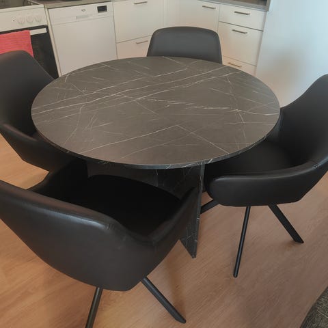 Jysk ruokapöytä ja tuolit, joissa valkoinen pyöreä pöytätaso ja puunväriset jalat. Tuoleissa on valkoinen istuinosa ja puunväriset jalat, muotoiltu selkänoja ja istuinmukavuutta lisäävä pehmuste. Sopii keittiöön tai ruokailutilaan useamman hengen ruokailuryhmäksi.