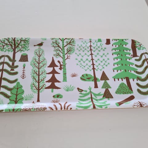 Myydään kuvan kauniste tarjotin, koko 28 cm x 13,5 cm. Tarjotin on ollut käytössä, joten pieniä käytön jälkiä löytyy jonkin verran. Scandinavian birch veneer, astianpesukoneen kestävä. Hinta 4 euroa.