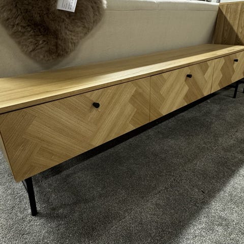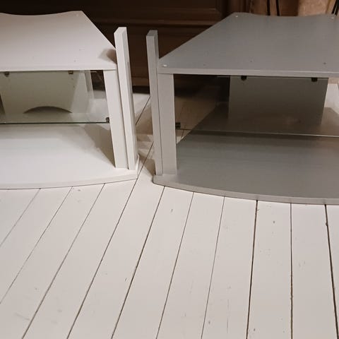 Selvittelyjen perusteella ilmeisesti Helsingissä 1994-2007 välillä toiminut, toimintansa jo lopettanut kalusteyritys Matsuniku Oy valmistanut tilaustyönä Marimekolle putki-tv tasoja?? Laatikko oli avaamaton ja nyt laatikko avattu vain jotta selvisi mitä laatikko sisältää. Kalustetta ei ole kasattu eikä sen enempää purettu pois laatikosta. Väri valkoinen, kellastumisesta ei tietoa. Sisältää myös lasihyllyn. Laatikon mitat n. 80x61x7 cm, paino 17 kg.