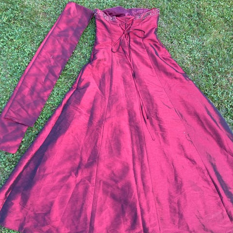 Myydään kauniisti laskeutuva, kirkkaanpunainen täyspitkä iltapuku. Mekossa on tyylikäs rypytetty vyötärö ja V-aukko edessä sekä takana. Materiaali on joustavaa ja mukava päällä (koko M).