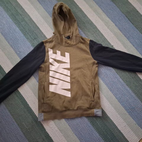 Musta Nike-huppari, koko 147-158 cm. Yhdellä lapsella käytössä ollut. Pientä mitoitusta. Väri haalistunut, muuten moitteeton. Kultaiset kirjailut hihoissa.