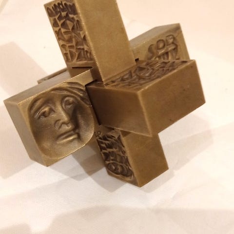 Laila Pullisen Suomen punaiselle ristille SPR suunnittelema pronssiveistos Hädän kolmet kasvot, 1977.