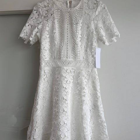 Bubbleroomin lyhyt valkoinen pitsimekko kultaisella vetoketjulla. Erittäin hyväkuntoinen, käytetty kerran ylioppilasjuhlissa ja pesty sen jälkeen. Kokoa 32, mutta kavennettu ompelijalla. Olka-olka 35 cm, vyötärön leveys vyötärönauhan kohdalta 64 cm, pituus kaula-aukosta helmaan 80 cm. Lisäksi mekkoon ommeltu tuplavuori, jonka ansiosta mekosta ei näy ollenkaan läpi.