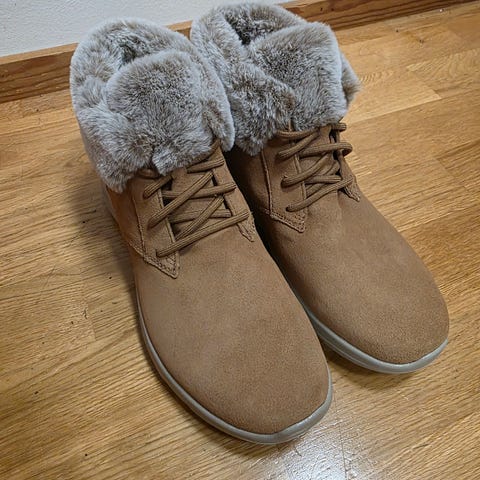 Skechers tohvelit, koko 38. Ruskeat, pehmeällä karvareunuksella ja -vuorella varustetut sisäkengät. Päällinen mokkanahkaa tai mokkajäljitelmää, vaalea joustava kumipohja. Sopivat sisäkäyttöön ja lämmittämään jalkoja viileämmässäkin sisälämpötilassa.