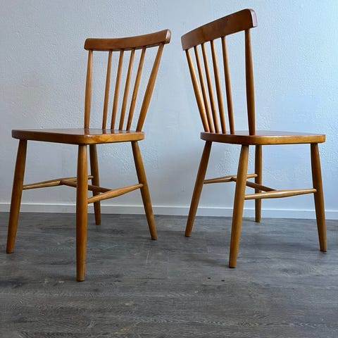 Teak istuimella varustettu vintage pinnatuolit myytävänä. Rungot ja liimaukset molemmissa hyvässä kunnossa. Maalissa käytön jälkiä. Istuinkorkeus 44 cm. Myydään parina.
