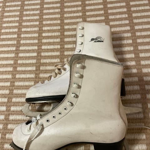 Taitoluistimet, koko 39. Väri valkoinen. Perinteinen nauhakiinnitys ja terät taitoluisteluun tai muuhun luisteluun. Juuri teroitettu.