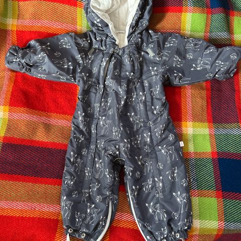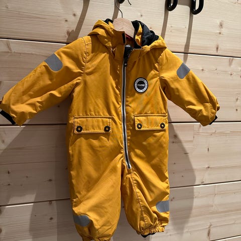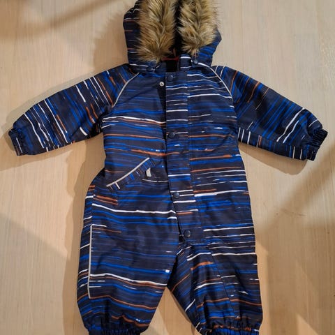 Jonathan haalari, koko 74. Lahkeissa heijastinnauhat ja jalkalenkit. Paksu, hyväkuntoinen toppahaalari ja Reima töppöset.