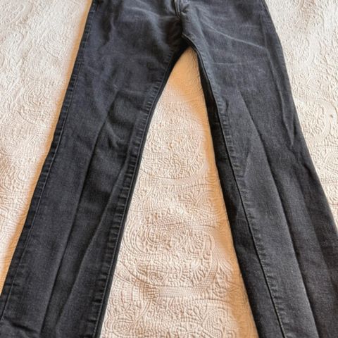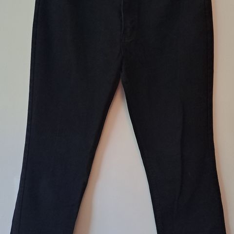 Uudenveroiset mustat farkut, ehkä kerran jalassa käyneet. Koko 40/32. Vyötärönympärys n. 104cm, lahkeen sisäpituus n. 81cm. Materiaali 83%puuvilla, 15% PCV, 2% elastaania. Suora malli.
