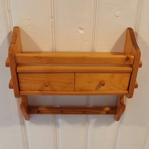 Mustaksi maalattu vanha vanerihylly jossa 4 koukkua ja tanko. Hyllytasossa kulumaa.