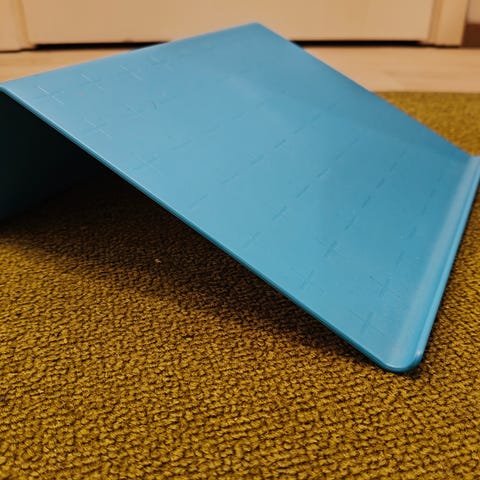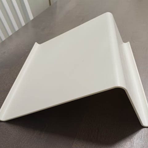 Vähän käytetty Ikean Isberget-tablettiteline. Vaaleaa muovia. Pieniä käytönjälkiä, ehjä. Tason koko n. 21x25 cm.