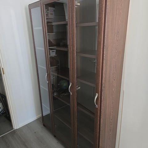 Kolme lasihyllyä. Kolme sivua lasisia, takaseinä kiinteä. Toimii moitteettomasti.