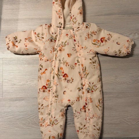 Joutsenkuvioinen vauvan haalari. Fleecevuori ja kevyt toppaus. Irrotettava karvakaulus.