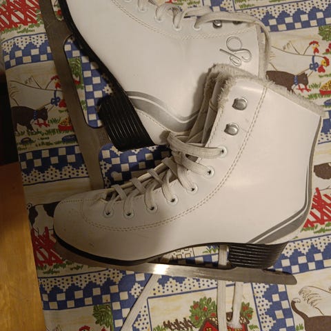 Princess taitoluistimet, koko 33. Valkoiset lasten luistimet nauhakiinnityksellä. Terät ovat perinteiset taitoluistinterät. Pientä käytön jälkeä, mutta yleisilmeeltään siistit. Mieluiten nouto. Kulkeutuu tarv. Kotkaan.