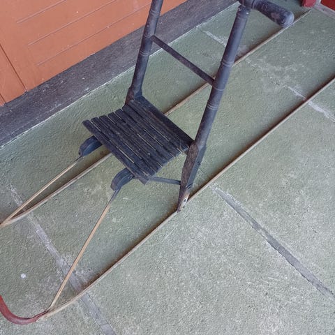 Potkukelkka ja kasaan taittuva . Saapi hyvän jos hioo ja maalaa/ lakkaa . Tämä löytyy Ähtäristä.