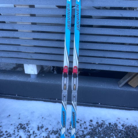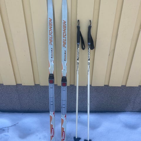 Lapselle hyvät harjoittelusukset. Mukaan Karhu 110cm sauvat. Meillä ollut 2 lapsella käytössä. Käytön jälkiä siis on, mutta oikein hyvin käy vielä seuraavalle.