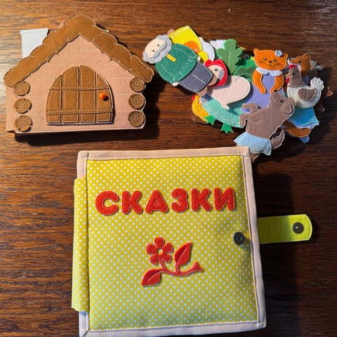 Tämä käsintehty kangaskirja (quiet book) on suunniteltu erityisesti venäjänkielisille perheille ja auttaa lasta oppimaan ensimmäiset runot helposti leikin kautta.