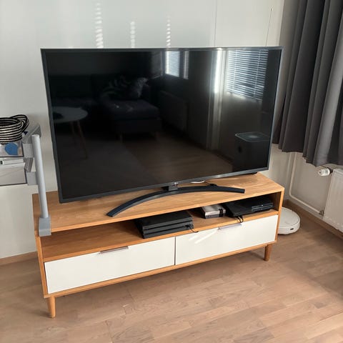 Tyylikäs tv-taso, pientä pintakulumaa ja yksi vetonuppi irti pienestä laatikosta. Kasvi ei kuulu mukaan.