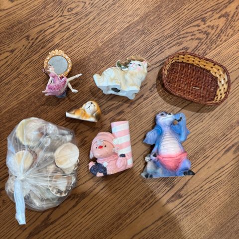 Annetaan sukkahousuja, punottu olkikori ja vanulappuja.