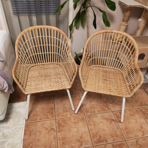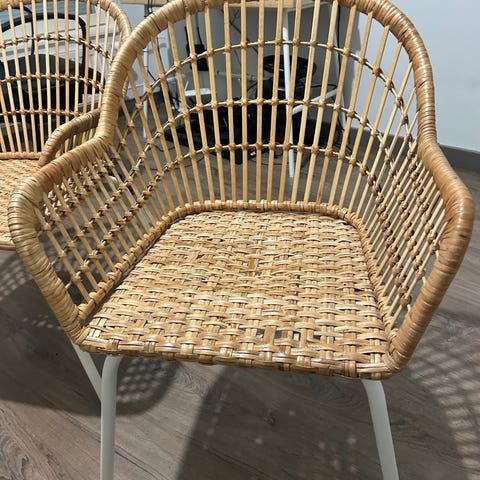 Myydään muuton vuoksi kuvan Nilsove tuolit. Kunto muuten erinomainen mutta yhdessä tuolissa rottinki rikkoutunut pieneltä alueelta, ks kuva. Ei vaikuta käyttössä. Pehmusteet mukaan, pesty juuri. Vain nouto, myyn mieluiten pakettina.