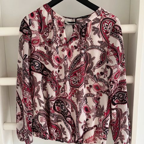 Hyväkuntoinen tummansinisellä kuvioitu neulosmainen ohut jakku, jossa taskut.
