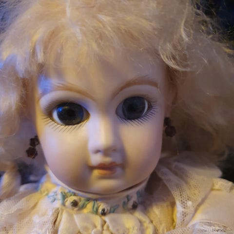 Kauniisti maalattu antiikkinuken repro. Korkeus 22cm, lasisilmät ja hiukset mohairia. Teline tulee mukaan.