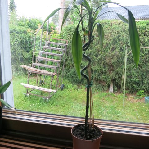 Viherkasvi mustan koristeellisen ruukun ja kastelupallon kera. Kastelupallo annostelee vettä tasaisesti ja vähentää käsin tehtävää kastelua. Kasvi tekee hyvin uusia versoja ja on elinvoimainen.
