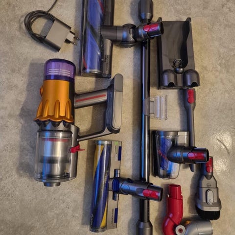 Dyson johdoton varsi-imuri, juuri huollosta kotiutuneena. Kuvissa ei näy muuta kuin runko, mutta kaikki alkuperäisen myyntipakkauksen osat ja suulakkeet ovat kunnossa ja tulevat mukaan. Laite kävi Dysonin huollossa kun antoi virhekoodeja - palasi moottori, syklooni ja ”main body” vaihdettuna (eli oikeestaan vanhaa ei juurikaan jäänyt).