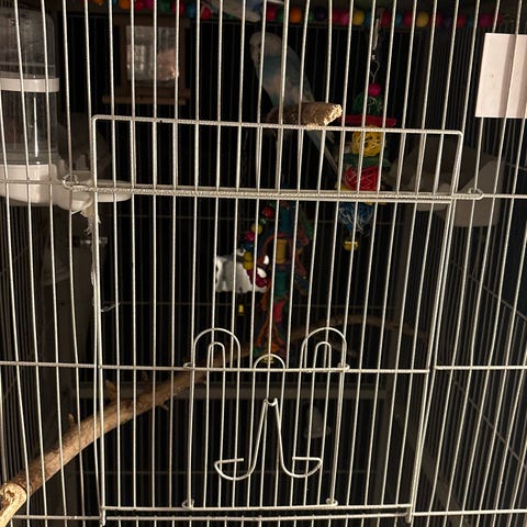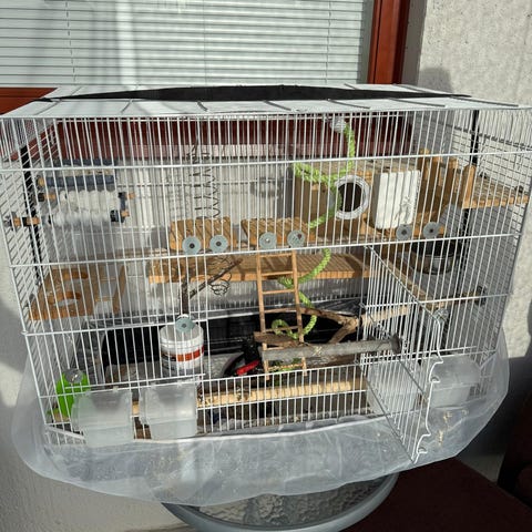 On ruostumaa pohjassa, ja katosta puuttuu yksi ruuvi, mutta katto pysyy hyvin paikoillaan kolmella ja nippusiteen voi laittaa jos yhtään epäilyttää. Häkki on purettuna varastossa tällä hetkellä, pesty pintapuolisesti.