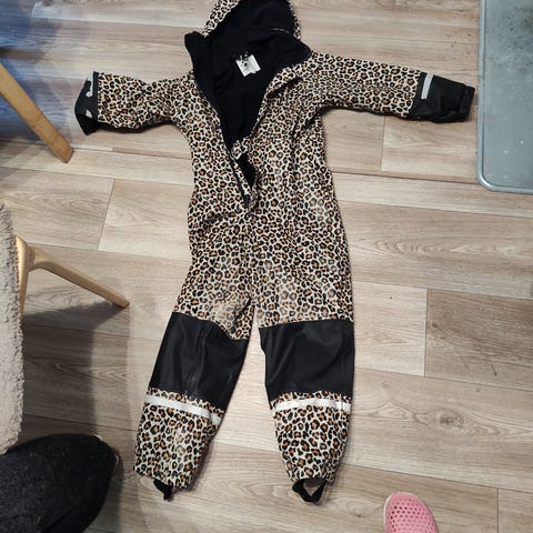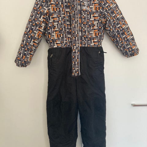 Lasten unisex-haalari, koko 128. Haalarissa on mustat lahkeet ja monivärinen yläosa, jossa on kuviollinen kangas. Edessä on pitkä vetoketju helpottamassa pukemista. Hihansuissa ja lahkeissa on kuminauharesorit. Sopii ulkoiluun ja leikkeihin viileämpiin säihin.