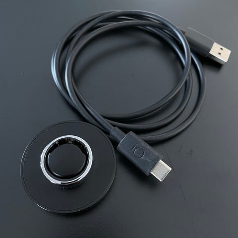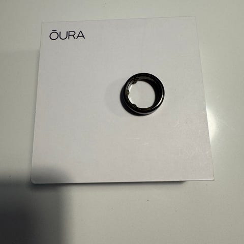 Oura sormus, väri musta, koko 6. Akunkesto on 3-4 päivää. Normaalia kulumaa läheltä tarkastellessa. Mukana laturi, joka toimii USB C-kaapelilla, kaapelia ei tule mukana.