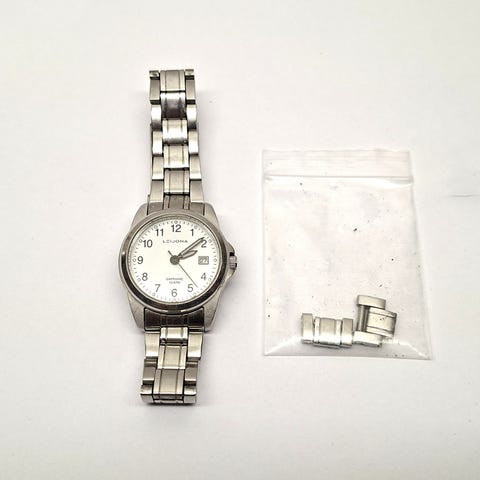 Naisten Leijona kullatulla teräsrannekkeella, jossa on 23 x 17 mm valkoinen kellotaulu kullatuilla viisareilla.Kello on vesitiivis 30 metriin saakka.