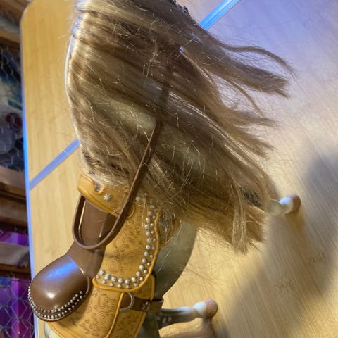 Muovinen leikkihevonen, jossa on irrotettava satula ja suitset. Hevosella on harja ja häntä, joita voi harjata ja muotoilla. Sopii hevosteemaiseen leikkiin ja esimerkiksi nukkekotien tai muiden lelujen kanssa käytettäväksi. Muovimateriaali on helppo pyyhkiä puhtaaksi käytön jälkeen.