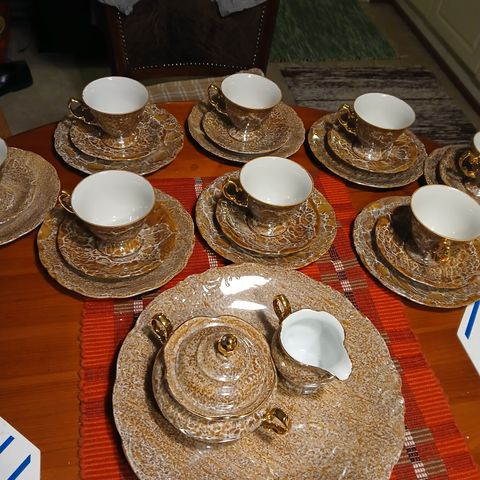 Myydään ylimääräiseksi jäänyt kultakeramiikan kahviastiasto.