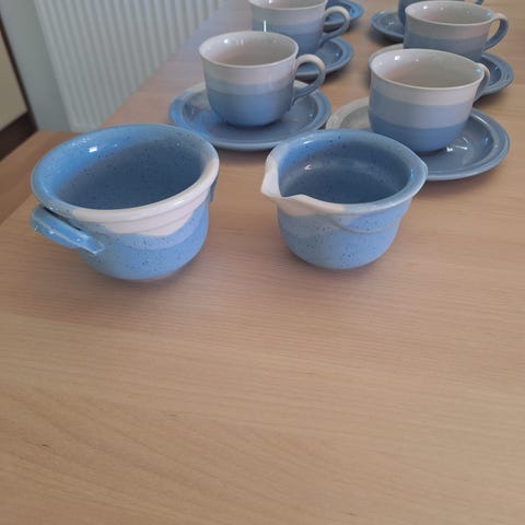 13kpl kuppeja ja lautasia + aluslautasia+2kpl sokerikkoja+ 1kpl kansi+2kpl maito/ kermakannuja.