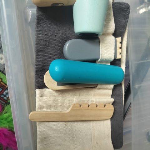 Kampaamon pöytä ja ostoskärryt. Settiin kuuluu kampaamon peilillä, pöydässä joku suhku, josta voi tulla vettä oikeasti, ei testattu. Mukaan muovinen ostoskärry.