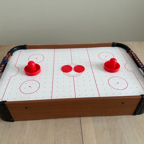MP Sports ilmakiekko-peli pöytämalli. Pöydässä on valkoinen pelialusta, jossa on maalialueet ja pyöreät kohdemerkinnät, sekä mustat laidat. Jalusta ja runko ovat mustat punaisilla yksityiskohdilla. Peliin kuuluu useita kiekkoja ja mailoja (lyöntikahvoja). Soveltuu sisäkäyttöön vapaa-ajan pelaamiseen useamman pelaajan kanssa.