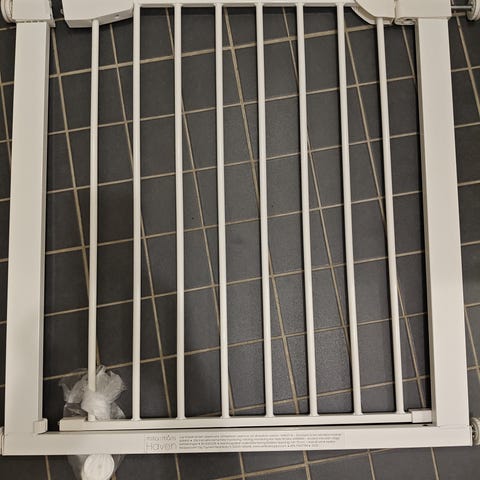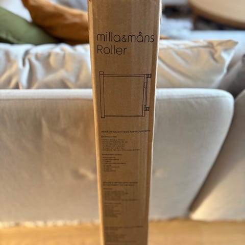 Käyttämätön rullaoviportti avaamattomassa paketissa. Portti on helppo avata ja sulkea, ja kun sitä ei käytetä, se rullautuu rullaverhon tapaan vieden hyvin vähän tilaa. Soveltuu oviaukkoon, jonka leveys on enintään 140 cm.