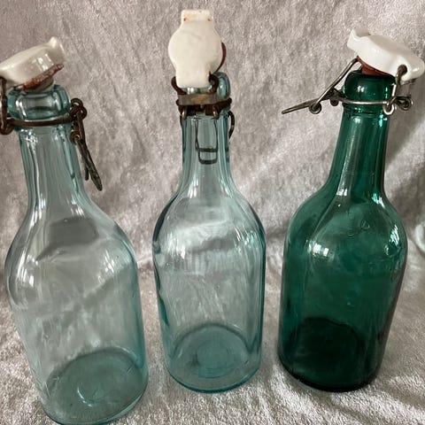 Myydään kuvassa näkyvät suolalasitetut kivitavarapullot. Tyypillisesti käsintehtyjä, 1800-luvun lopulta tai 1900-luvun alusta, peräisin pääasiassa Saksasta/Keski-Euroopasta. Suolalasitus kivitavaran päällä antaa pulloille niiden luonteenomaisen kirjavapintaisen, kiiltävän pinnan, mikä teki niistä vesitiiviitä ilman sisäpuolista lasitetta. Pohjissa ei ole leimoja tai merkintöjä.