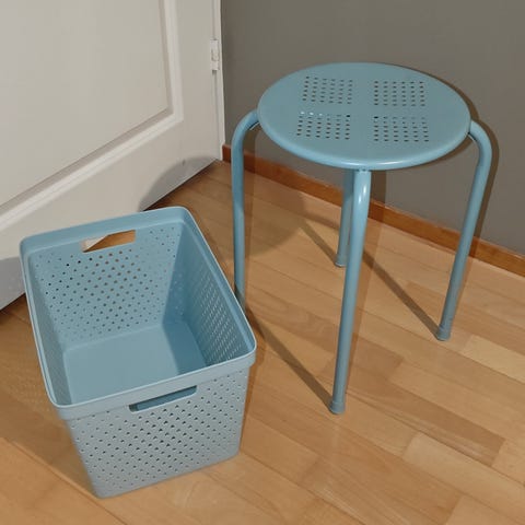 Kaksi ehjää jakkaraa. Kankaissa joitakin tahroja/värimuunnoksia, putsaus jää ostajalle.