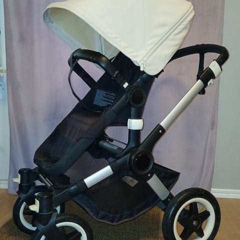 Bugaboo lastenrattaat vaunukopalla. Rattaissa on hyvässä kunnossa olevat pyörät (kääntyvät etupyörät) ja säädettävä työntöaisa. Istuinosassa on turvakaari. Mukana erillinen vaunukoppa, jonka väri on harmaa ja musta. Tekstiiliosat ovat mustan ja harmaan sävyisiä. Työntöaisassa ja rungon pehmusteissa on käytön jälkiä, jotka näkyvät kuvissa. Rattaat soveltuvat vauvalle vaunukopan kanssa ja isommalle lapselle istuinosan kanssa.